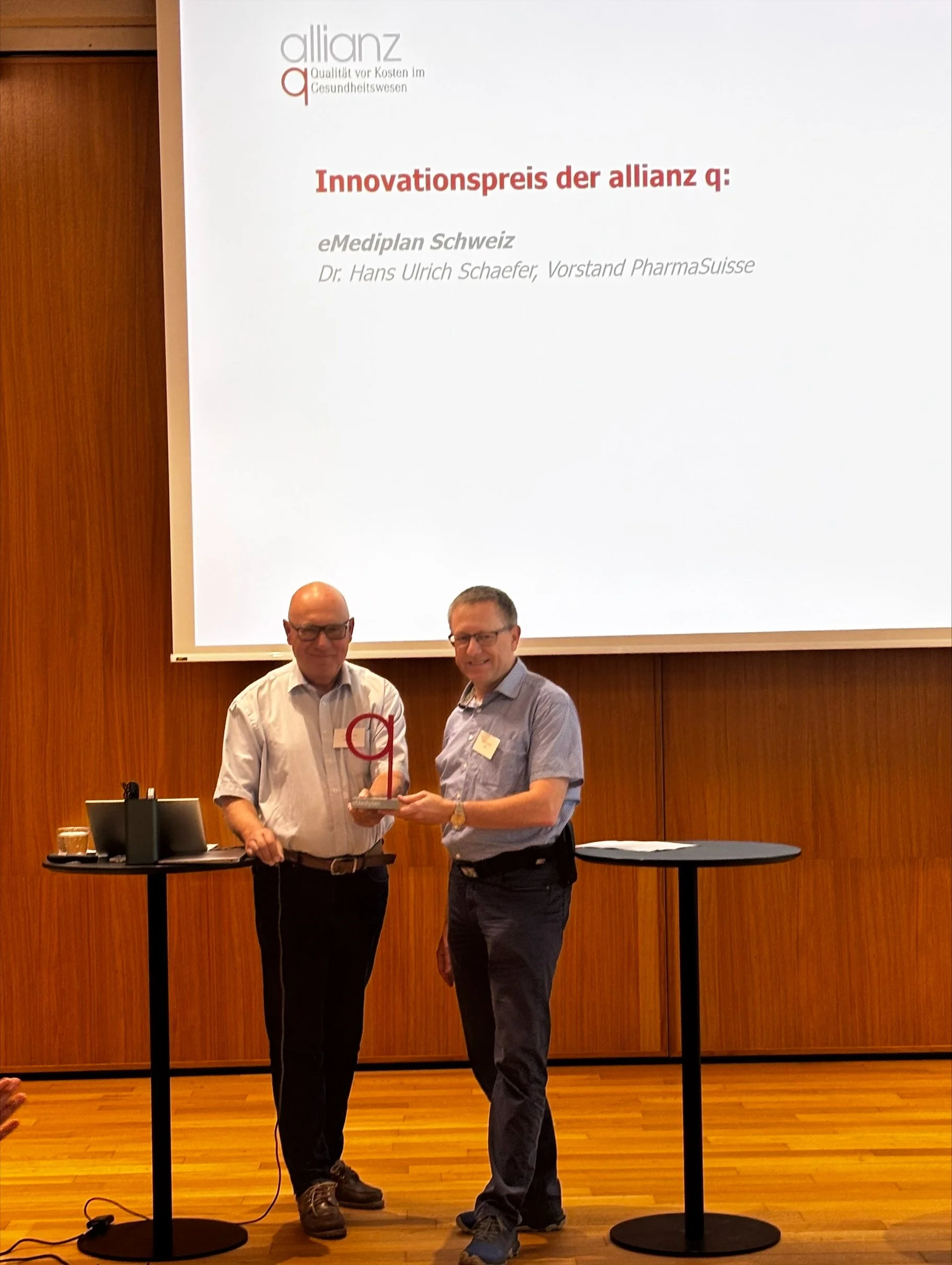 Die allianz q hat den Innovationspreis 2025 an die IG eMediplan übergeben. Die Preisverleihung fand im Rahmen des Stoos Seminars am 21. Juni statt. Dr. pharm. Ulrich Schaefer erhielt den Preis von Dr. med. Christoph Bosshard, der Mitglied des Organisationskomitees und Vizepräsident des Zentralvorstands der FMH ist. Ulrich Schaefer, Vorstandsmitglied der IG eMediplan und von PharmaSuisse, konnte am Anlass die geplanten Entwicklungsschwerpunkte der IG eMediplan vorstellen, die auf grosses Interesse stossen. Schaefer bedankte sich im Namen der IG eMediplan für den Preis und die grosse Wertschätzung, die damit verbunden ist.