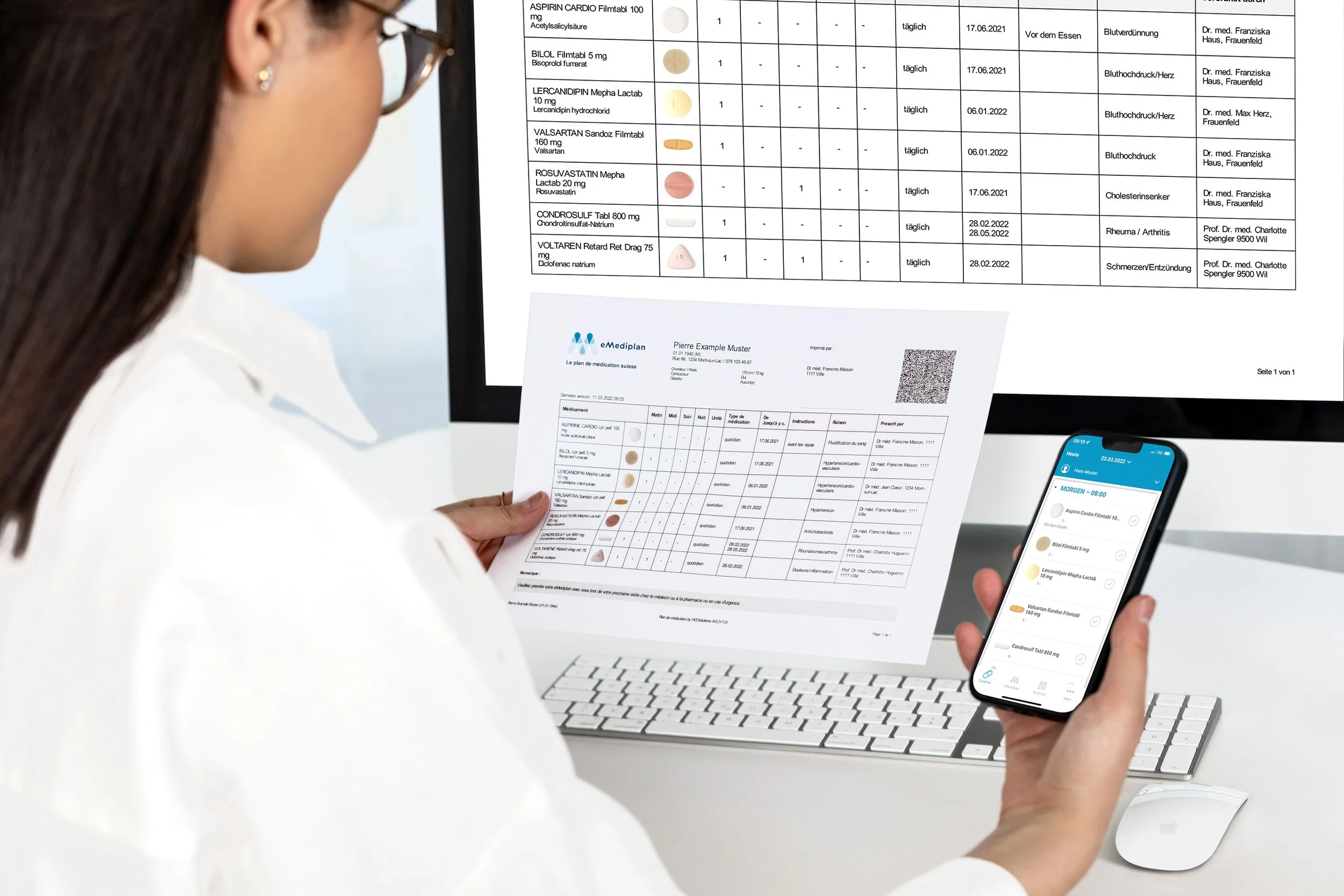 Der eMediplan zeigt die komplette Medikation in Text und Bild. Patientinnen und Patienten erleichtert er die korrekte Einnahme ihrer Medikamente und Gesundheitsfachleute können sich rasch einen Überblick über die aktuelle Medikation verschaffen. Dadurch können unerwünschte Wechselwirkungen und Doppelverschreibungen vermieden werden. Der eMediplan trägt so zu einer sicheren und effizienten Patientenversorgung bei.
